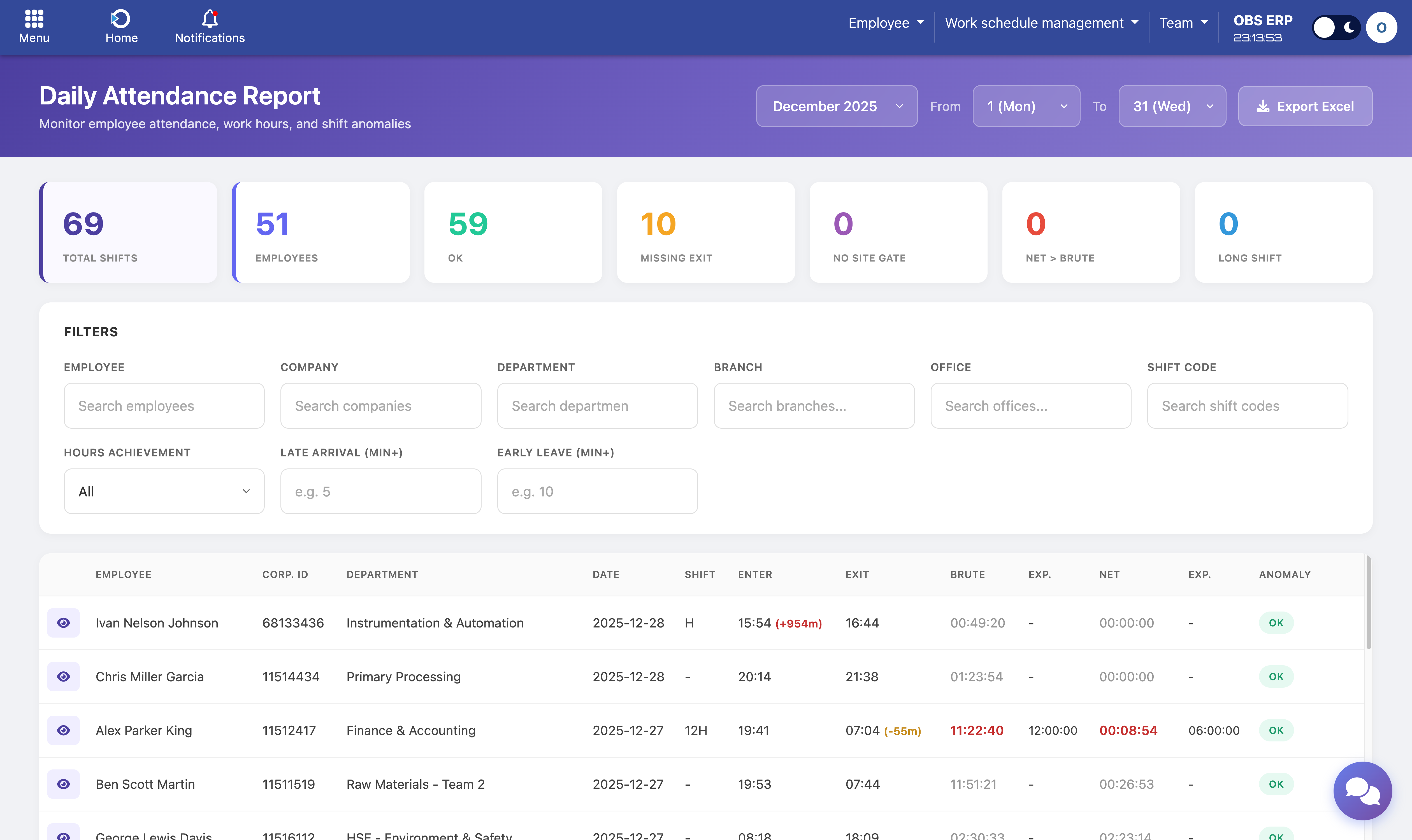 The Daily Attendance Report provides a complete, structured, and auditable view of employee attendance on a day-by-day basis. It is the primary operational report used by HR, administrators, and authorized managers to review presence, working time, deviations, and compliance with planned schedules.