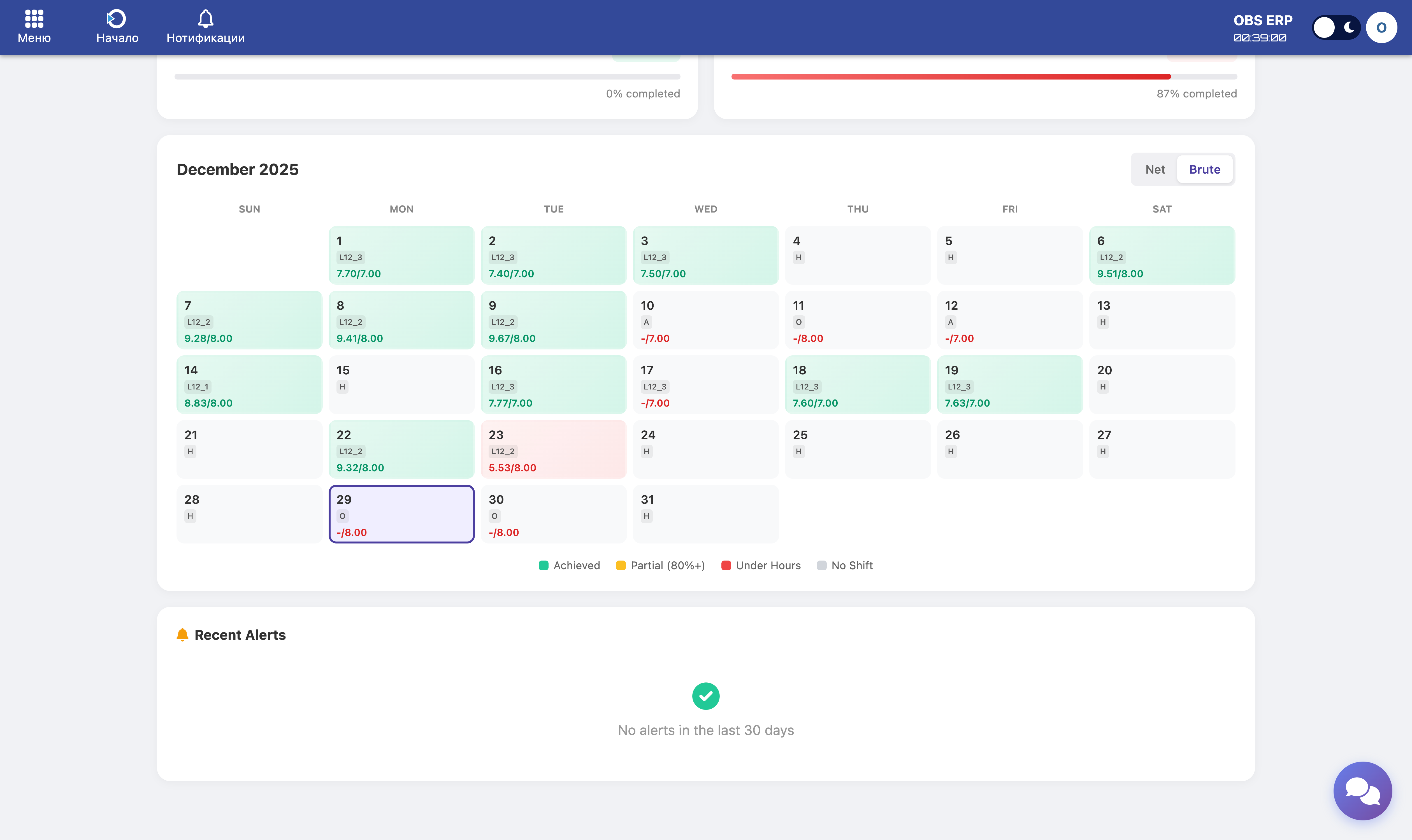 Monthly calendar showing daily status with color indicators and shift codes