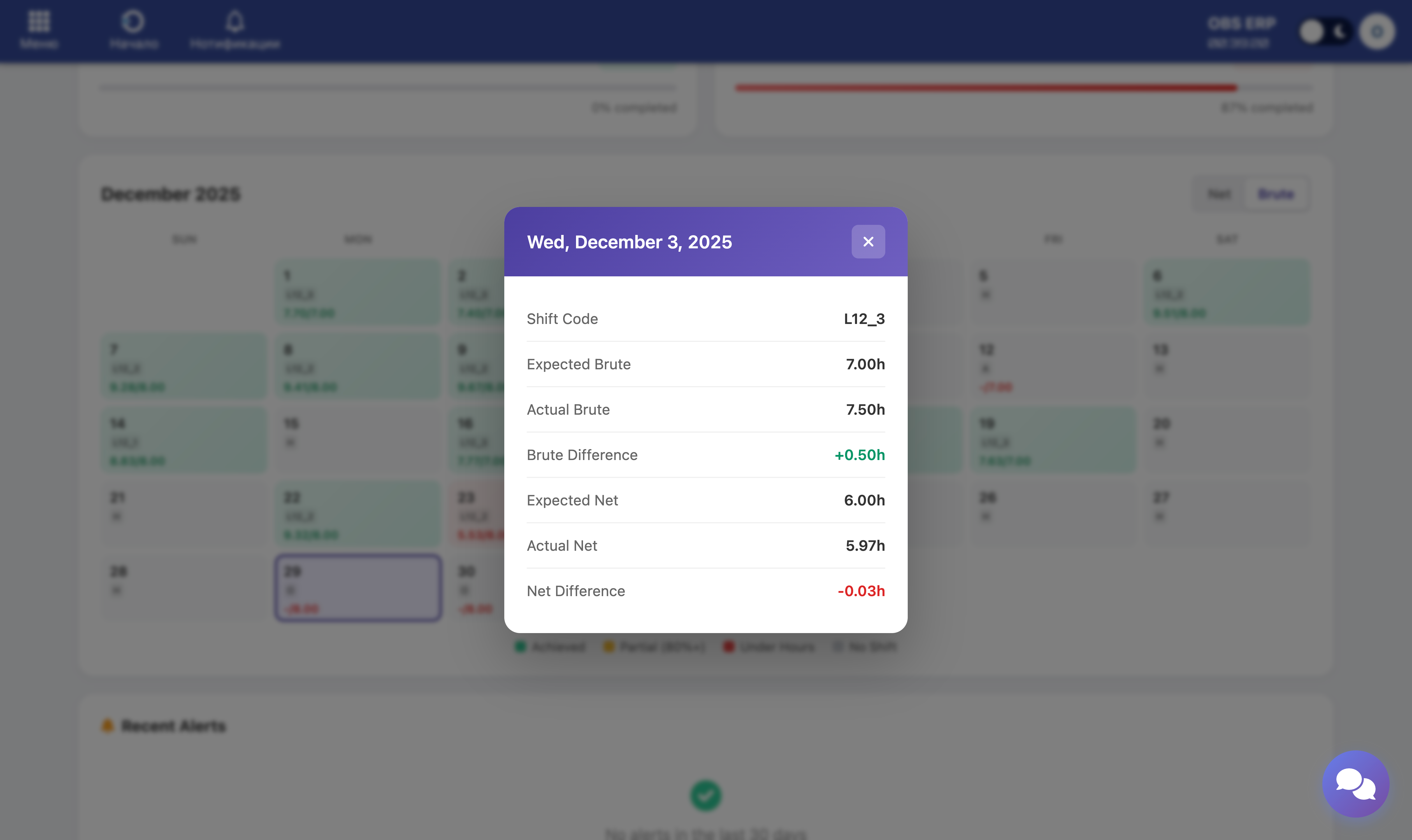 Day detail popup showing expected vs actual hours and movement list
