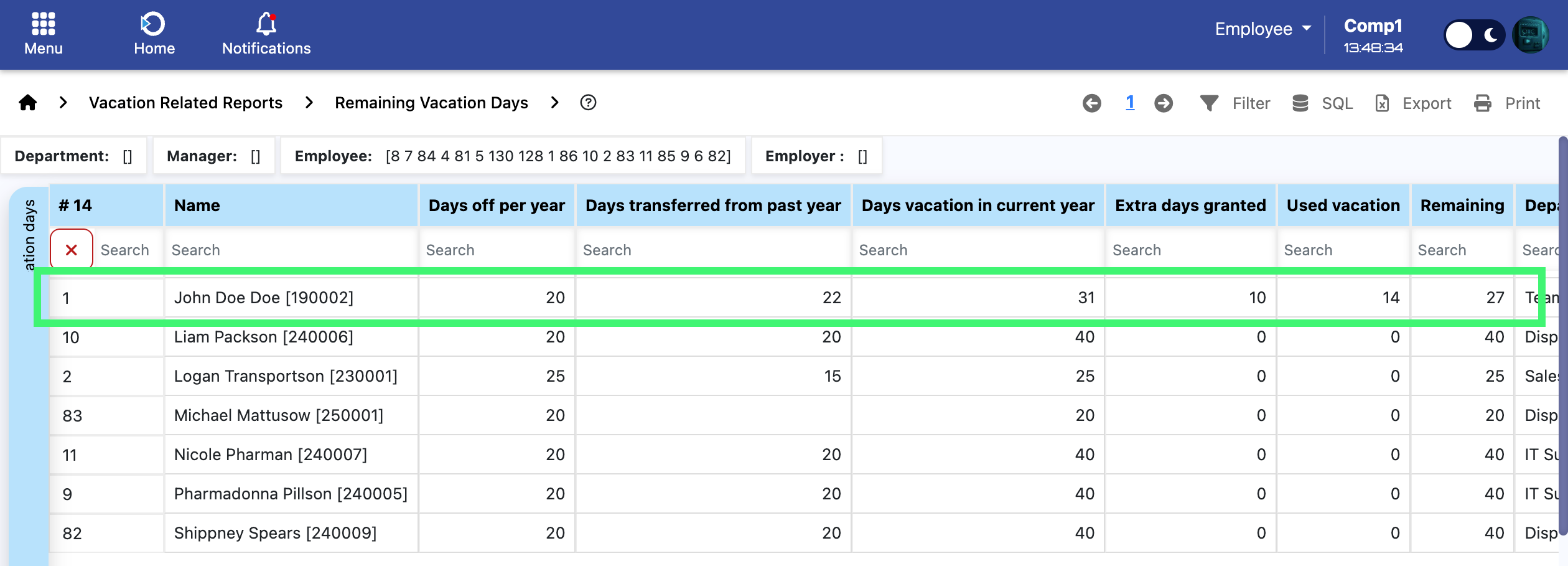 Location: Report “Remaining Vacation Days”. Highlighted is where Extra Days and final balance are shown.