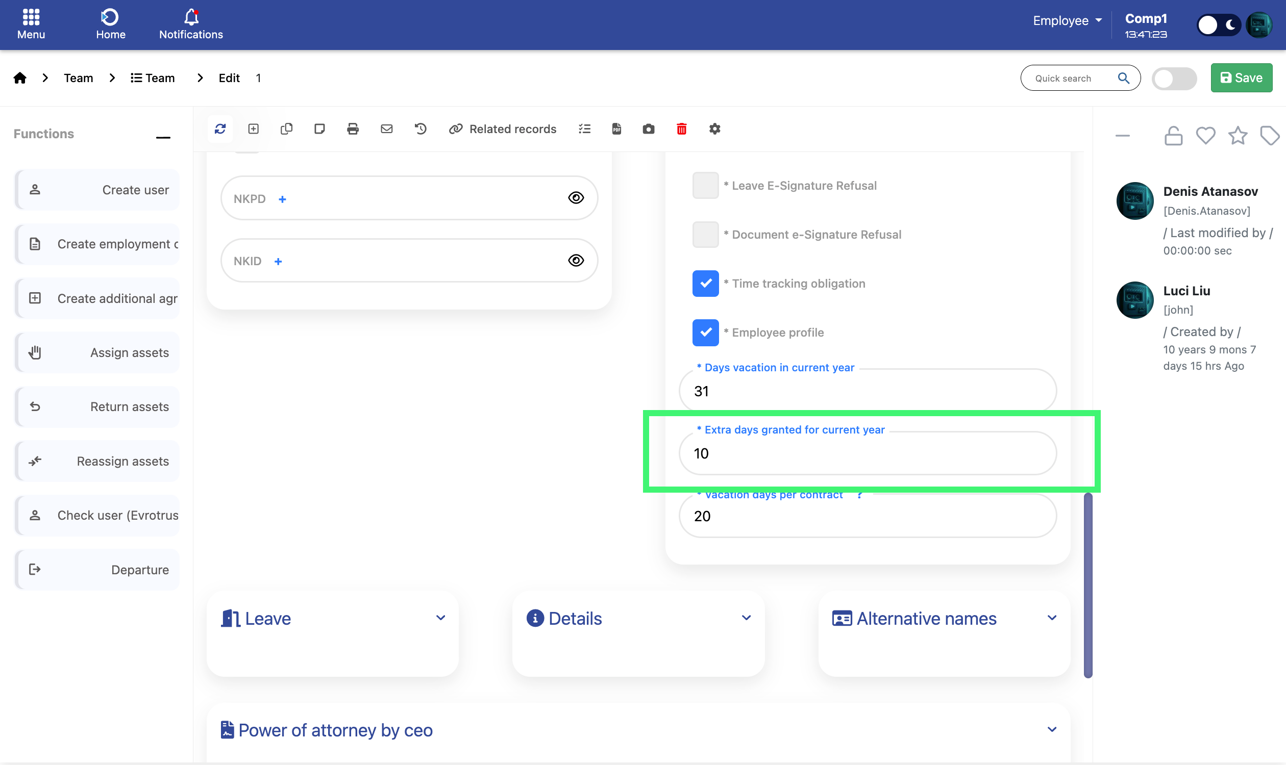 Extra days are managed directly inside the Team (Staff) module. Each employee profile contains a dedicated field: “Extra days granted in current year"