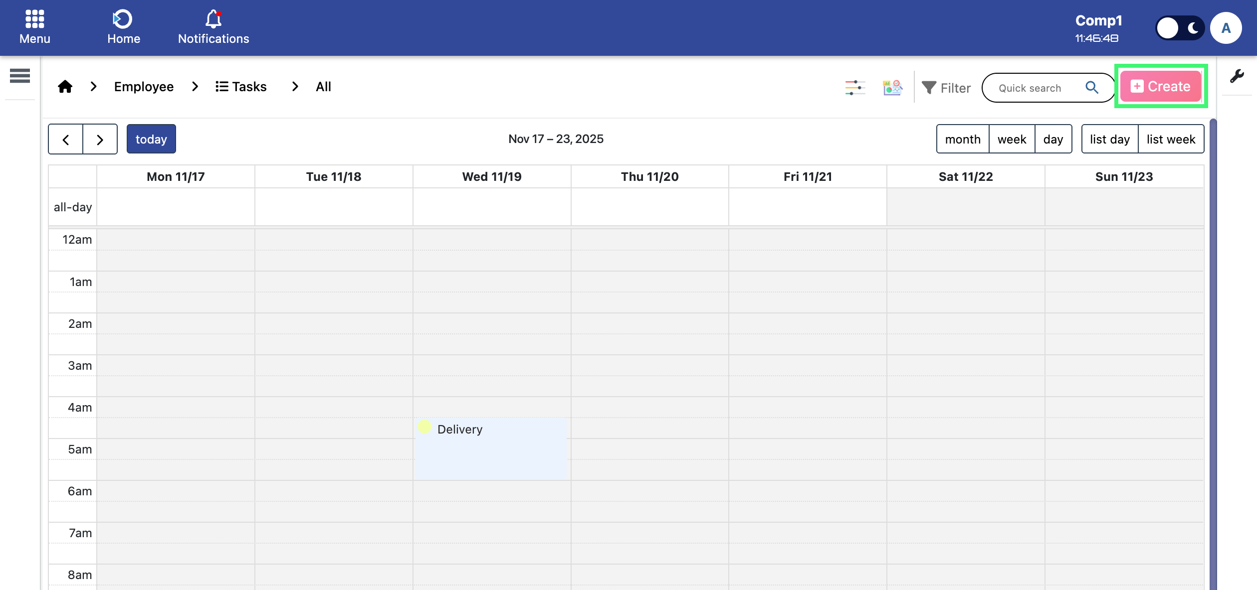 2. Click on the "Create" button or drag with the mouse on the desired time on the calendar to start a new task. Fill in the details such as task name, assignee, project, start and end time.