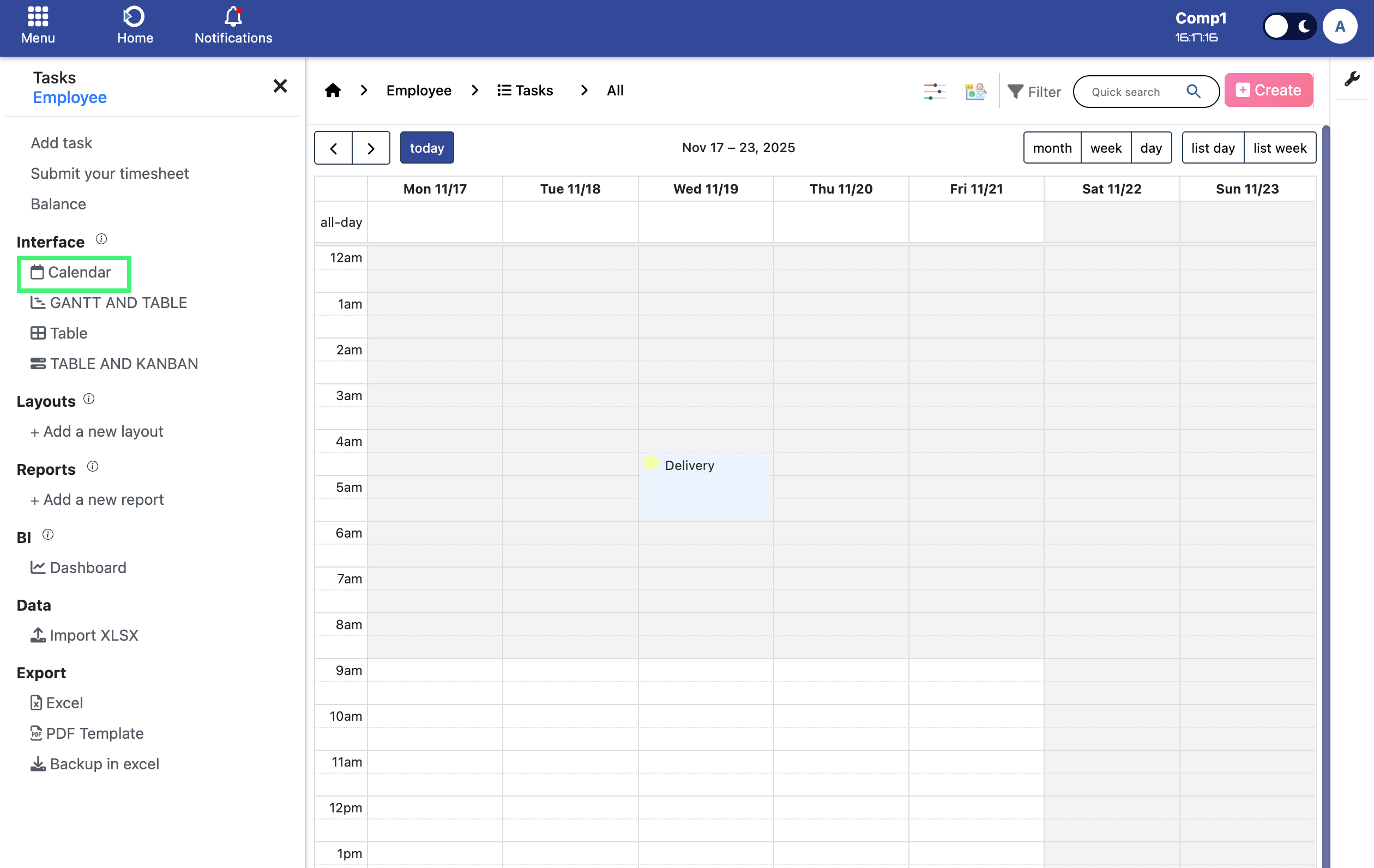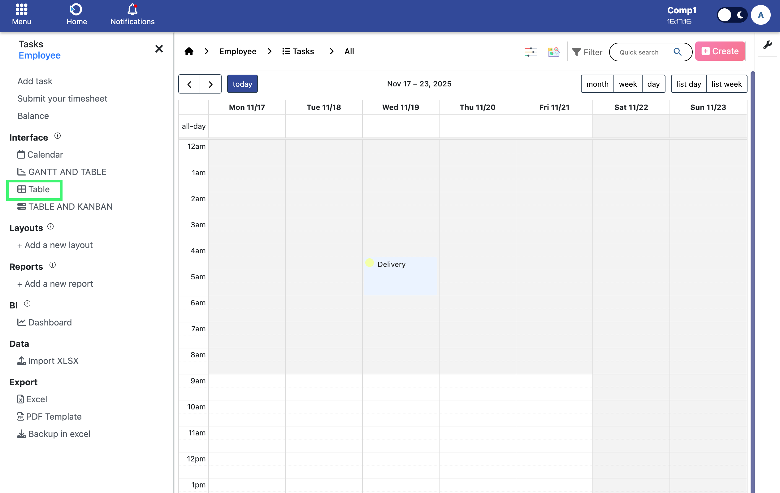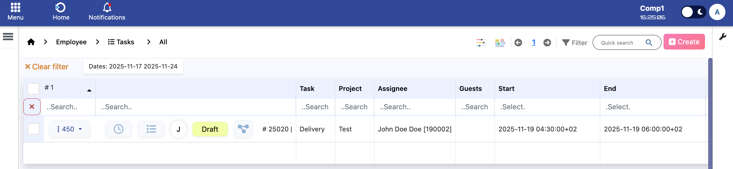 This opens the same task creation view as in the Calendar. After creation, the task will appear in the table view: