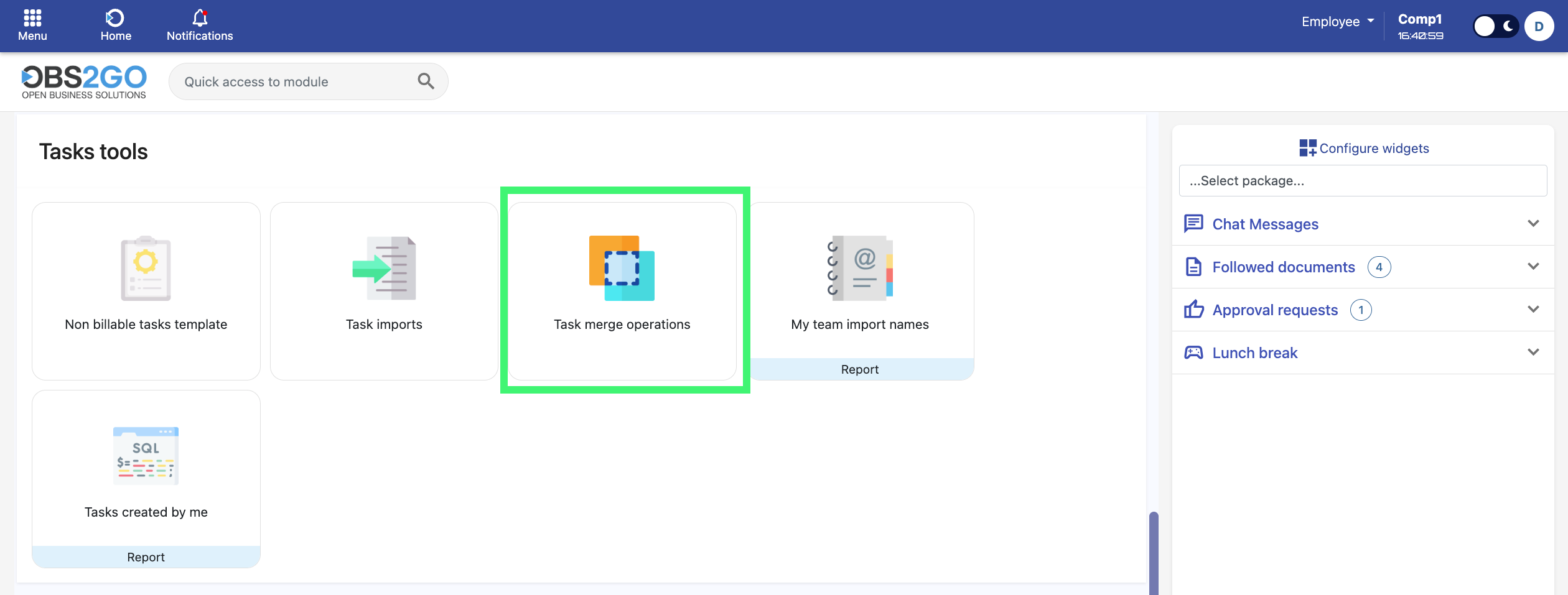 The Task Merge Operations module allows you to merge two existing tasks into one unified record. All participants, time entries, and related data are moved automatically to the task to keep. This ensures no work history or participants are lost when consolidating tasks.