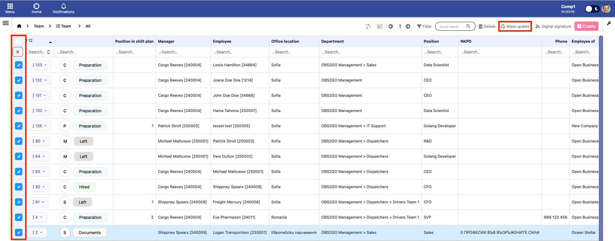 OBS ERP allows you to update a field value for multiple records at once using the bulk update option in table view. This is useful when you need to apply the same change to a group of records (e.g., updating a location field for several employees).