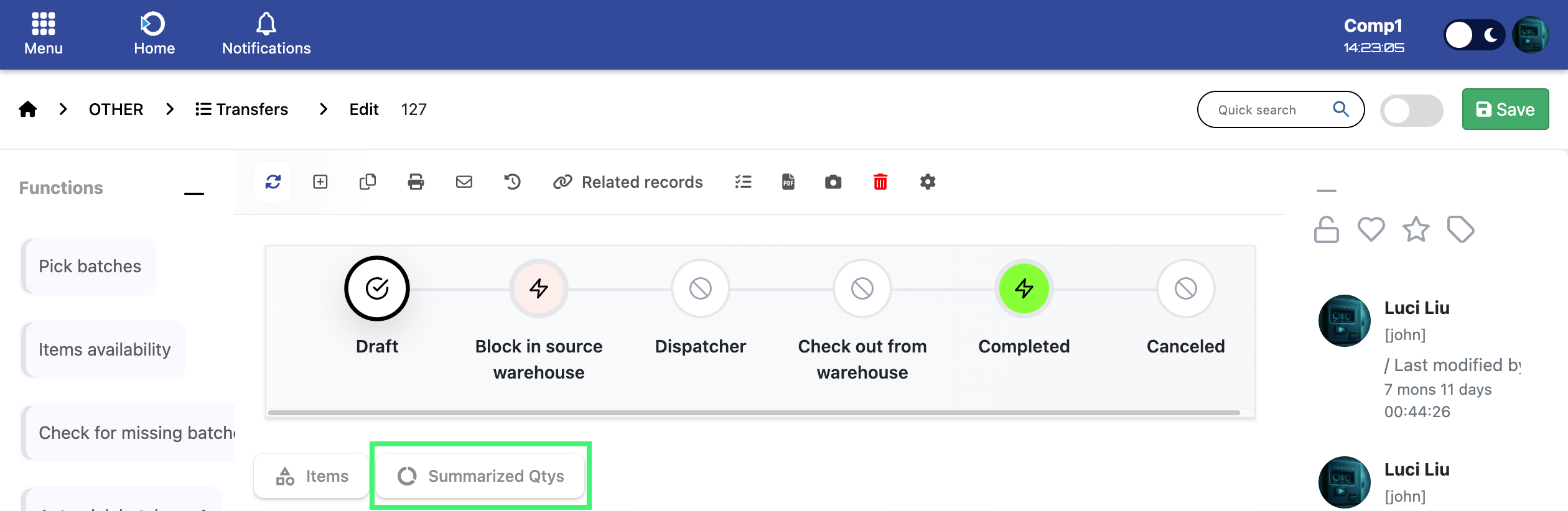 To view summarized item quantities for the transfer, click the Summarized Qtys button shown below.