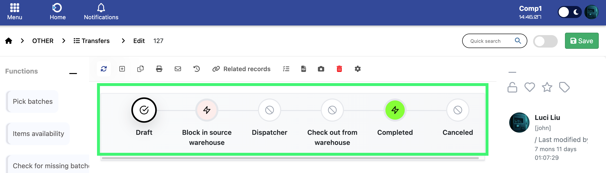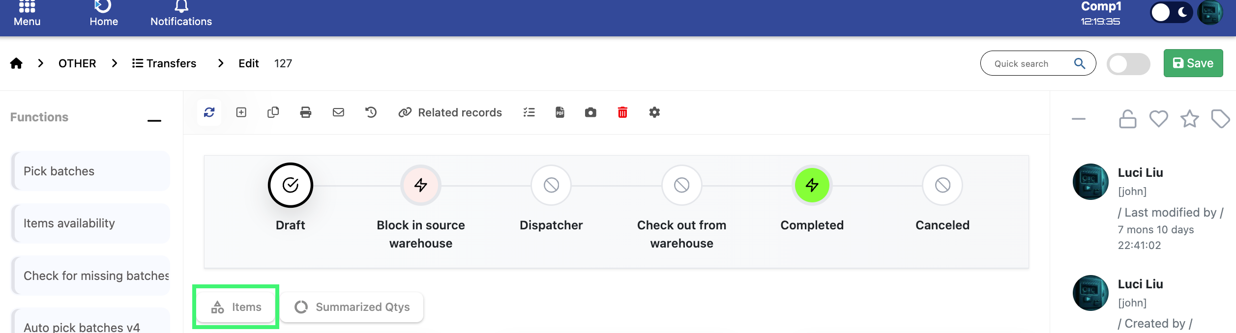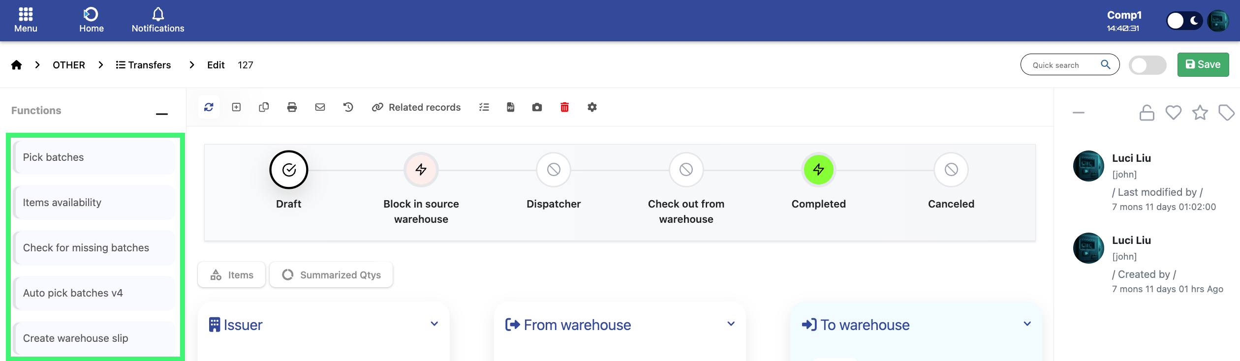 - Create warehouse slip – Generates a warehouse slip from the current transfer.